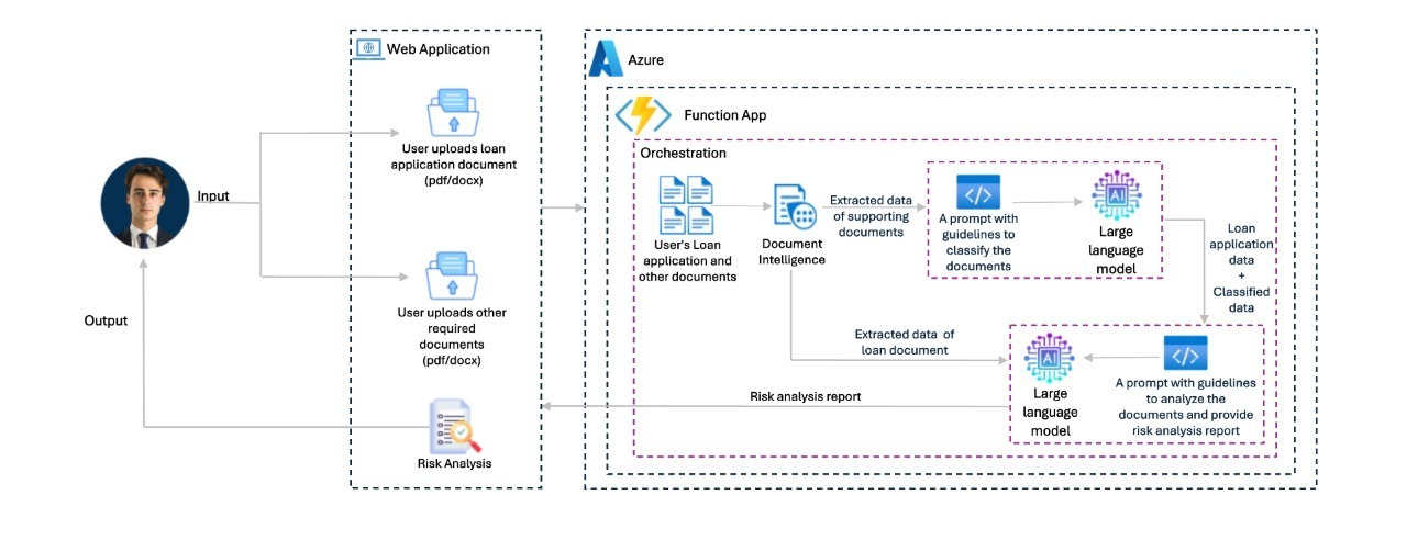 The system processes loan documents using Azure Document Intelligence to extract and validate key details. An LLM (Large Language Model) analyzes financial data, detects discrepancies, and assigns a risk level to the application. The system then generates structured insights, ensuring informed lending decisions.
